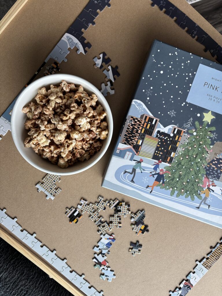 There are so many good movies and television shows that take place during the winter/holiday time and having a themed night cozied up at home can also spark inspiration for even more ideas on how to ease into winter. Watching winter themed movies is a fun way to get excited for the upcoming season and to glean ideas for yourself as well. Some shows or movies to watch are British Bake-Off Holidays, Sugar Rush Holidays, Knives Out, Little Women, The Holiday, Groundhog Day, Serendipity, The Grand Budapest Hotel, What Happens Later, and The Holdovers.