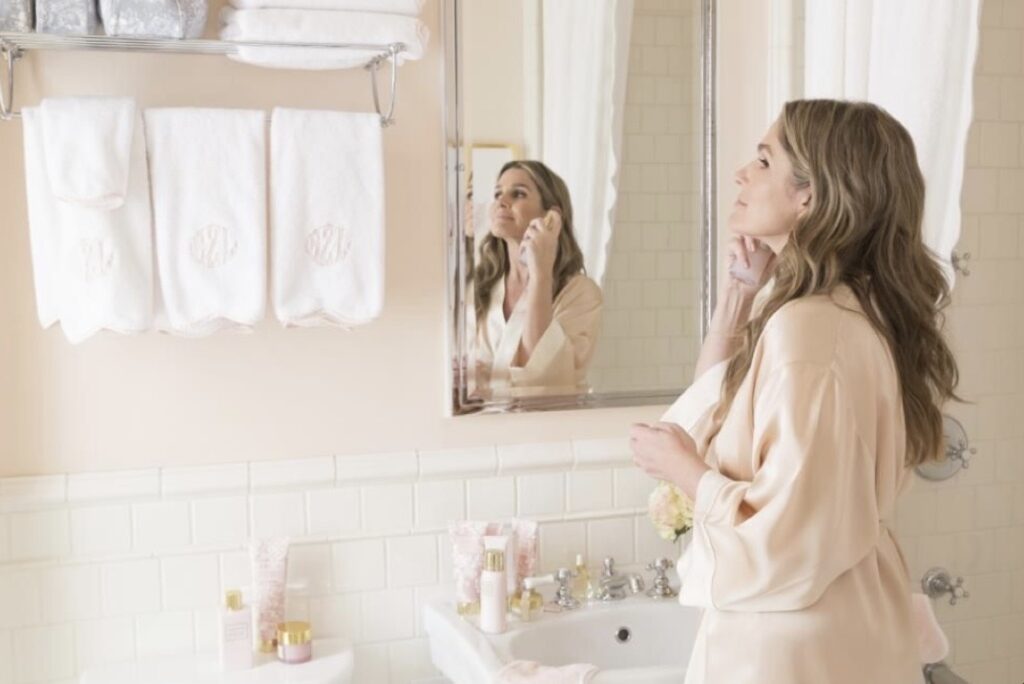 Aerin’s beauty is about femininity and looking like your best self everyday. It’s about healthy glowing skin over heavy makeup. Cream blushes, neutral eyes, defined brows and soft nude lips. Healthy hair that is slightly undone in soft waves, low buns, or simple ponytails. Also a delicate scent of florals, musk, or fresh woods.