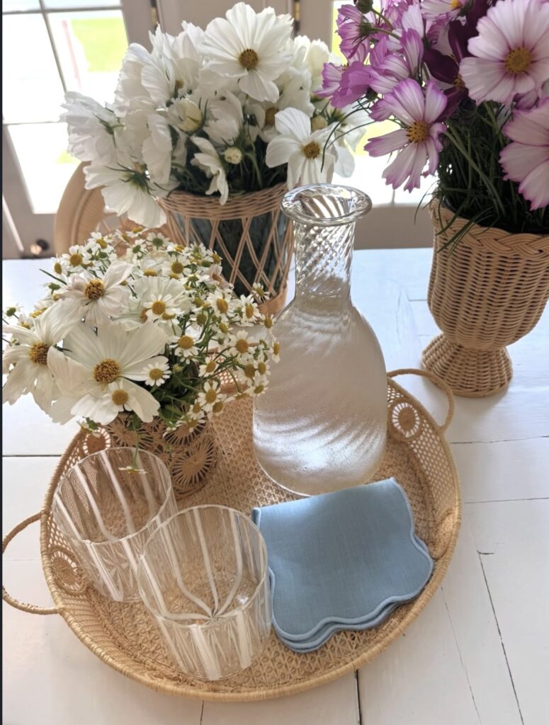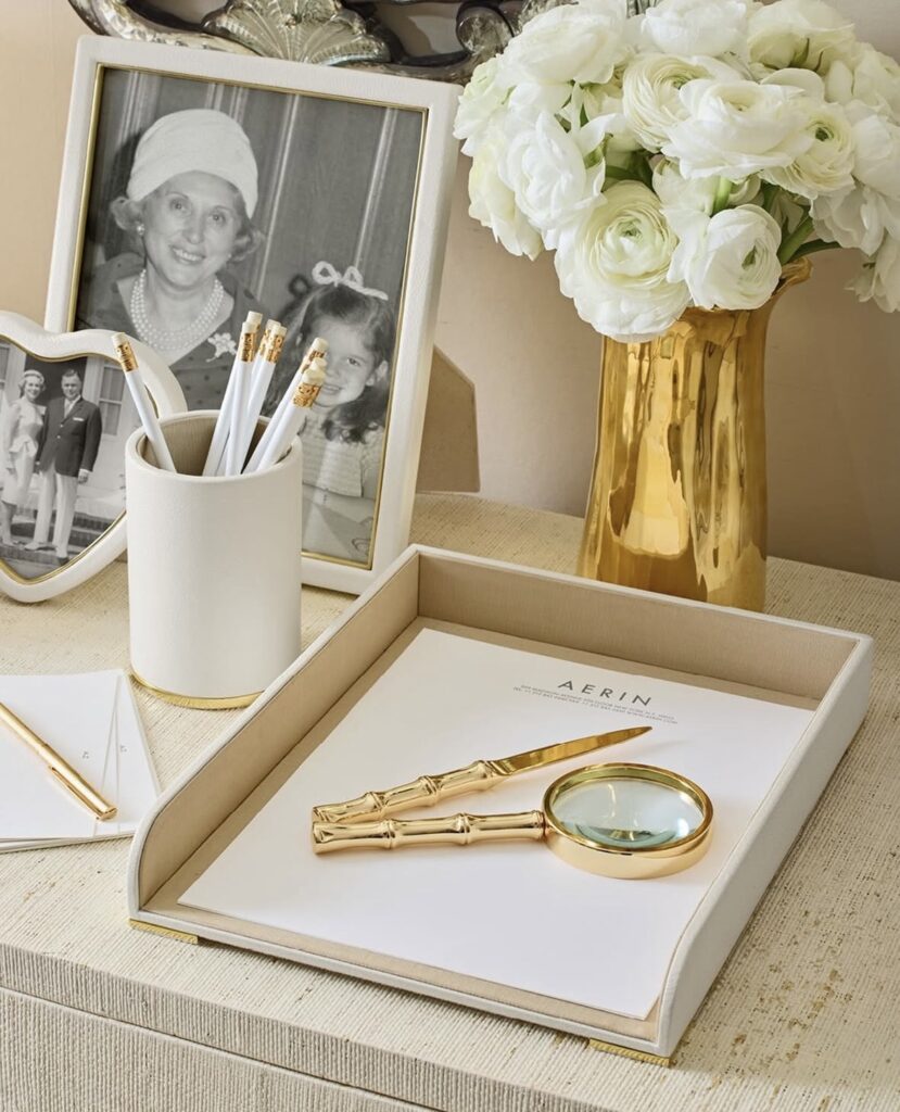 Aerin’s spaces feel airy, feminine, and collected over time. Some of the essentials are often natural textures of linen, wood, elevated silver or gold pieces, ceramics, and always fresh flowers. To curate this style one needs to edit ruthlessly and display meaningful objects, books, art, and heirlooms. There should be nothing overly trendy or cluttered. And as an extra tip, one beautiful tray can instantly elevate any space.