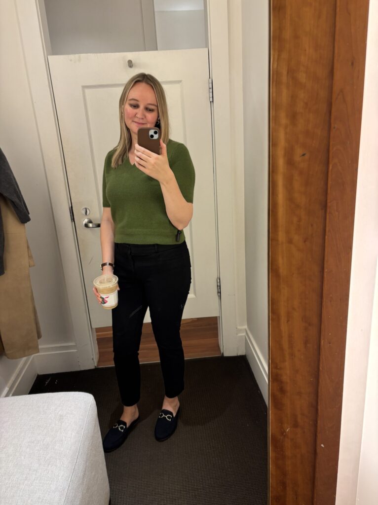I found this lovely green cashmere sweater that they did not have in my local store. I tried it on and loved it immediately, so it came home with me.
