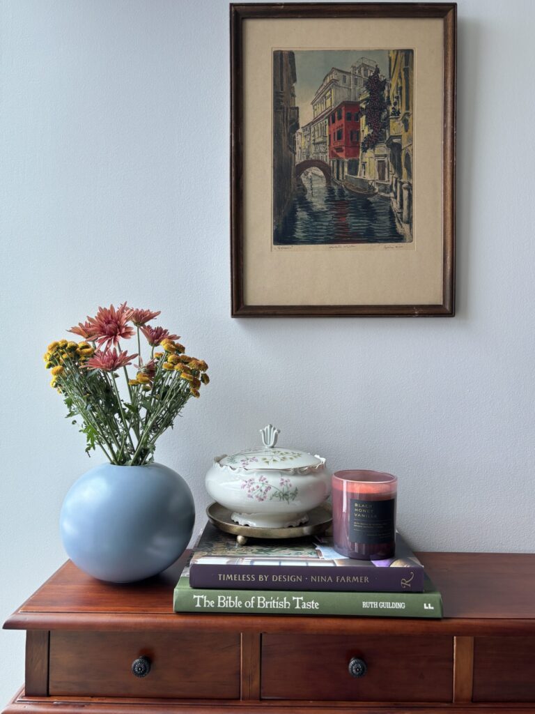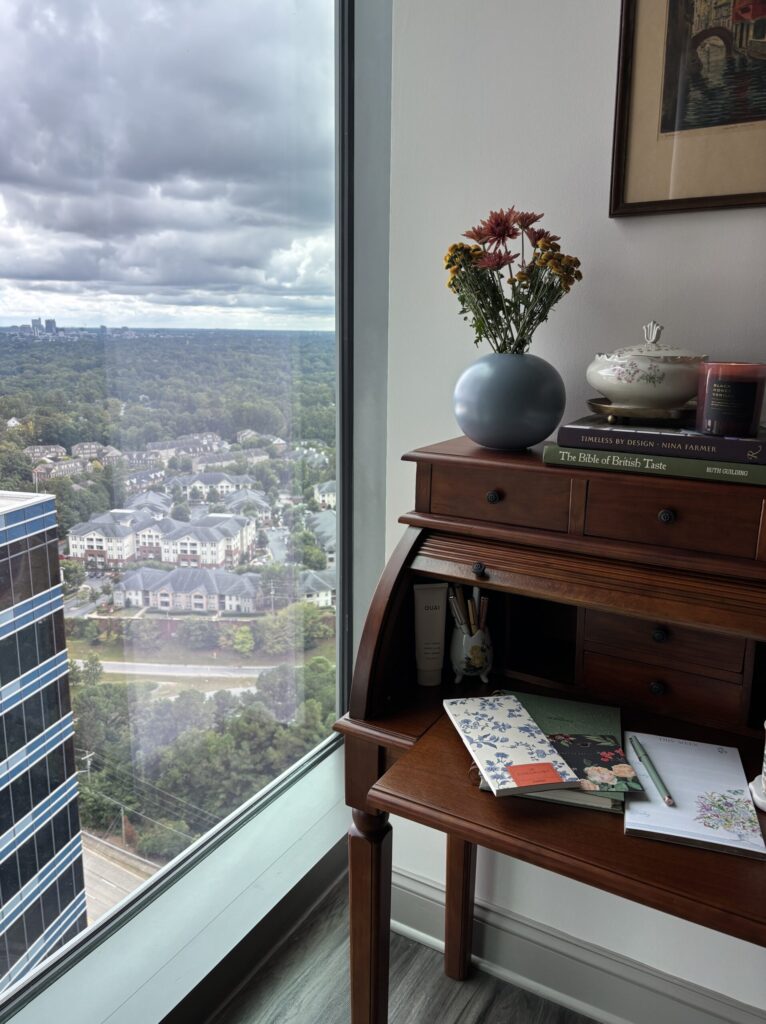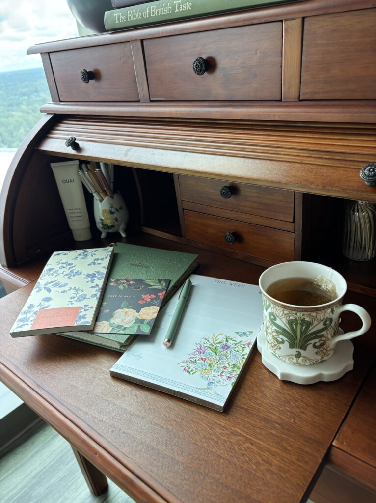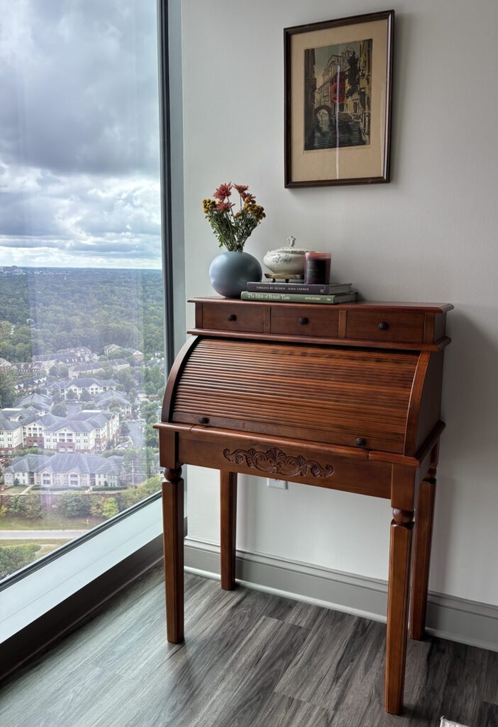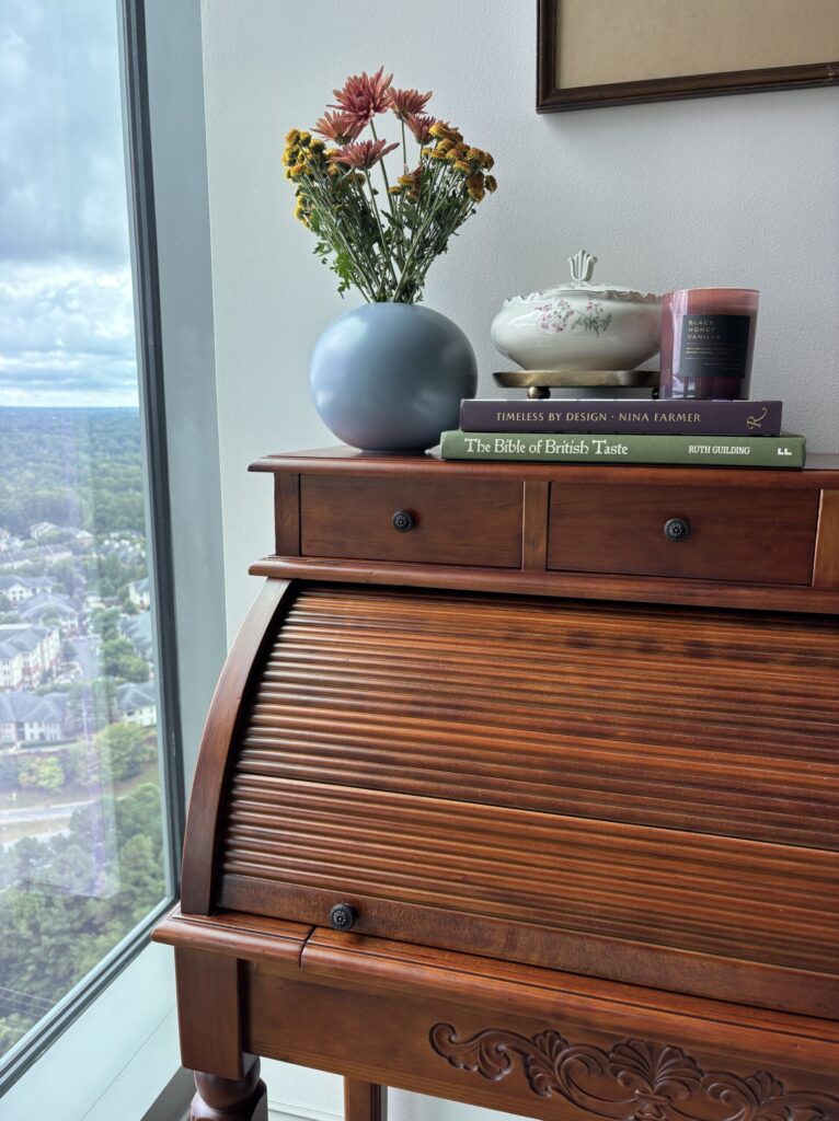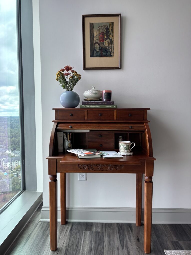 I love small, cozy spaces that feel beautiful and purposeful. When we moved into our 900 sq ft apartment back in February 2024, I knew that having a desk would take some thought and consideration. I do work from home on Mondays and Tuesdays, so I did want to incorporate a small workspace into our apartment at some point, and I was able to accomplish this goal just this past April with a small roll top desk.