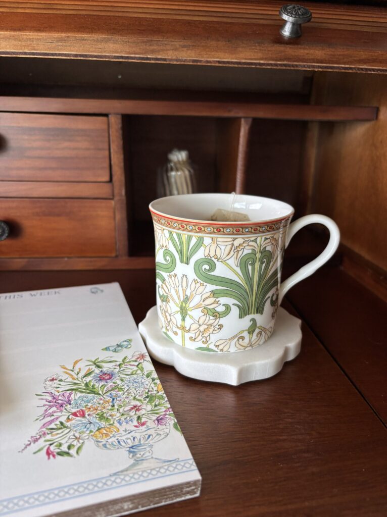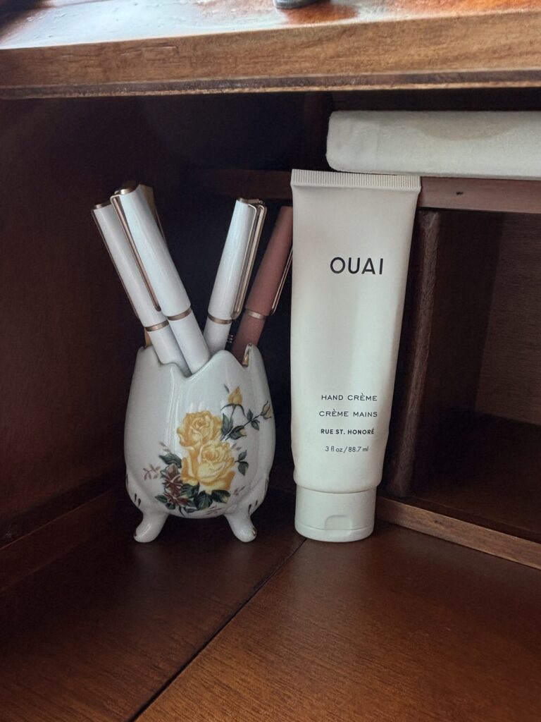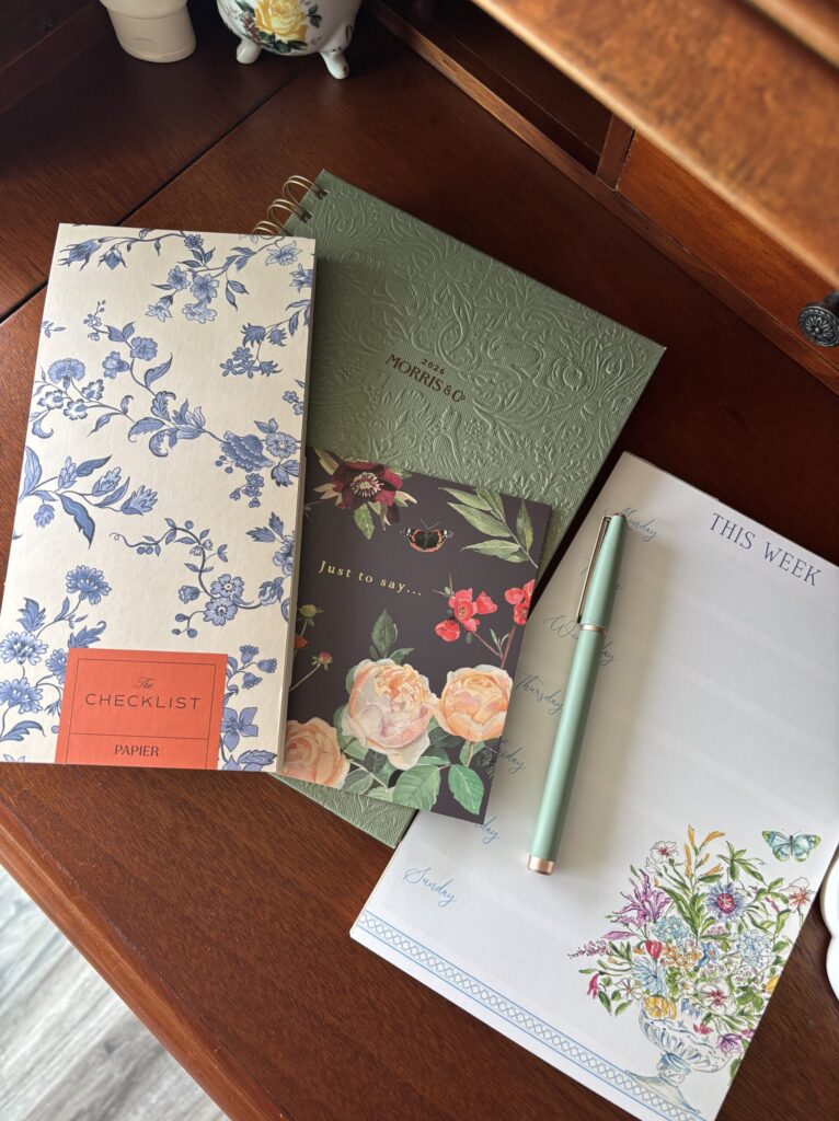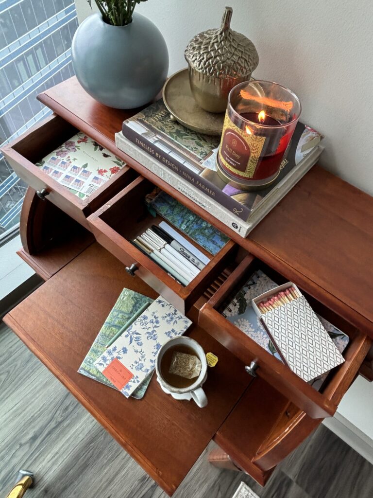 I keep a few things inside of the desk itself such a small container of pens, hand lotion, my journal, list pads, and some extra matches for candles. The pen holder I got from an antique store a few months prior.
