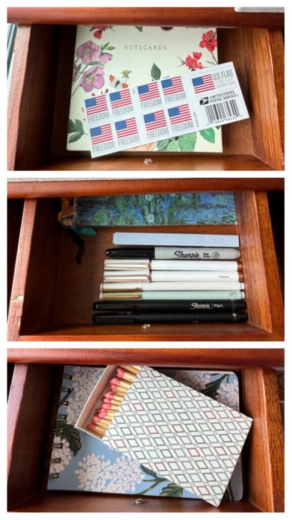In the top drawers I keep my stationery and stamps in one drawer, bookmarks and extra pens/markers/highlighters in the second drawer, and a spiral mini notebook and matches in the third drawer.