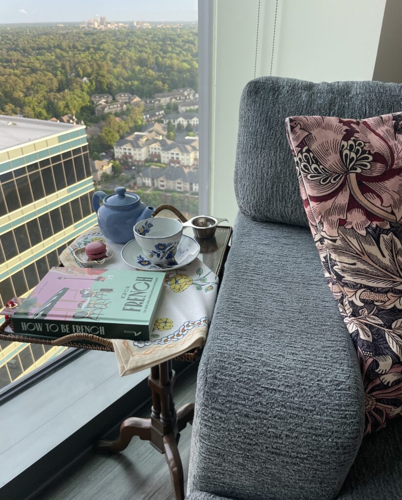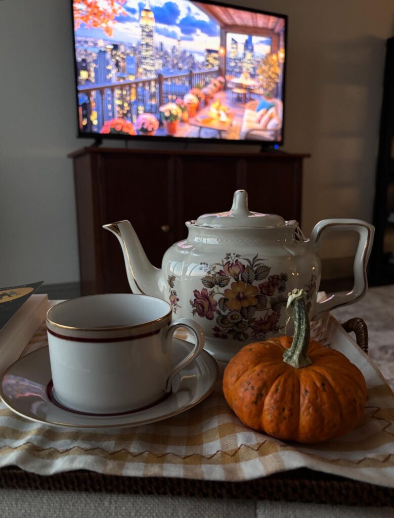 Bonus Tip: Light the scented candles, put on some smooth jazz or classical music, place a seasonal item on the tea tray and have some kind of reading material to enjoy such as a book or magazine.
